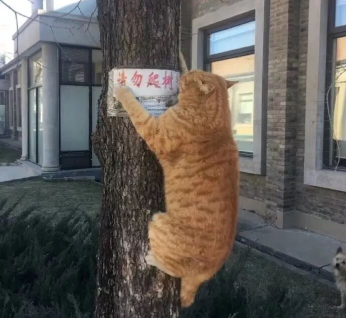Hey! You, the cat! I see you over there! The sign clearly says: Please don't climb this tree!"