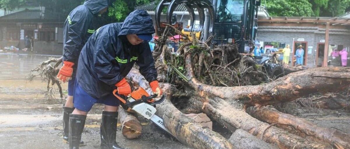 Staff members cut a flood-toppled tree with a chainsaw in Dinghu District of Zhaoqing City, south China's Guangdong Province, Aug. 6, 2025. (Xinhua/Xiao Ennan)