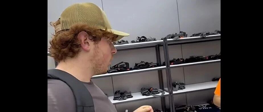 The two videos show the seller giving the Americans a full demonstration—strapping them into what he called a Sport Assist Robot, showing them how to change the mode, and explaining the AI system that he says can recognize when someone is walking.