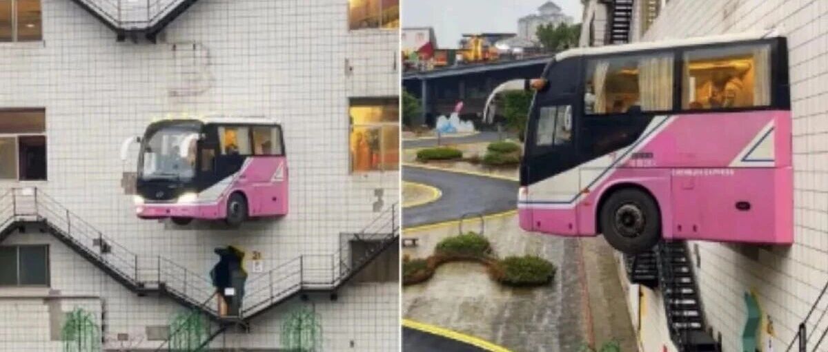 To create a viral tourist attraction, a property management company in Nan'an district, Chongqing, sawed a bus in half, with the front and rear sections mounted atop two separate buildings, thus forming the eye-catching illusion of a bus piercing through buildings, domestic news site gmw.cn reported.